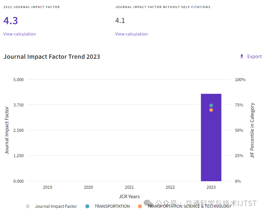 - 2024 年 6 月,科睿唯安公司发布 2023 年度期刊引证报告(Journal Citation Reports,JCR)。根据该榜单数据显示,《International Journal of Transportation Science and Technology》(IJTST,ISSN 2046-0430),今年首次获得影响因子( Imapct Factor),为 4.3,位于交通类 Q2 区,排名 15/57;交通科技类 Q2 区,排名 22/72。总被引频次 1162 次。IJTST 首次获得影响因子为4.3IJTST 2023 年度学科排名(JIF)在期刊引文...