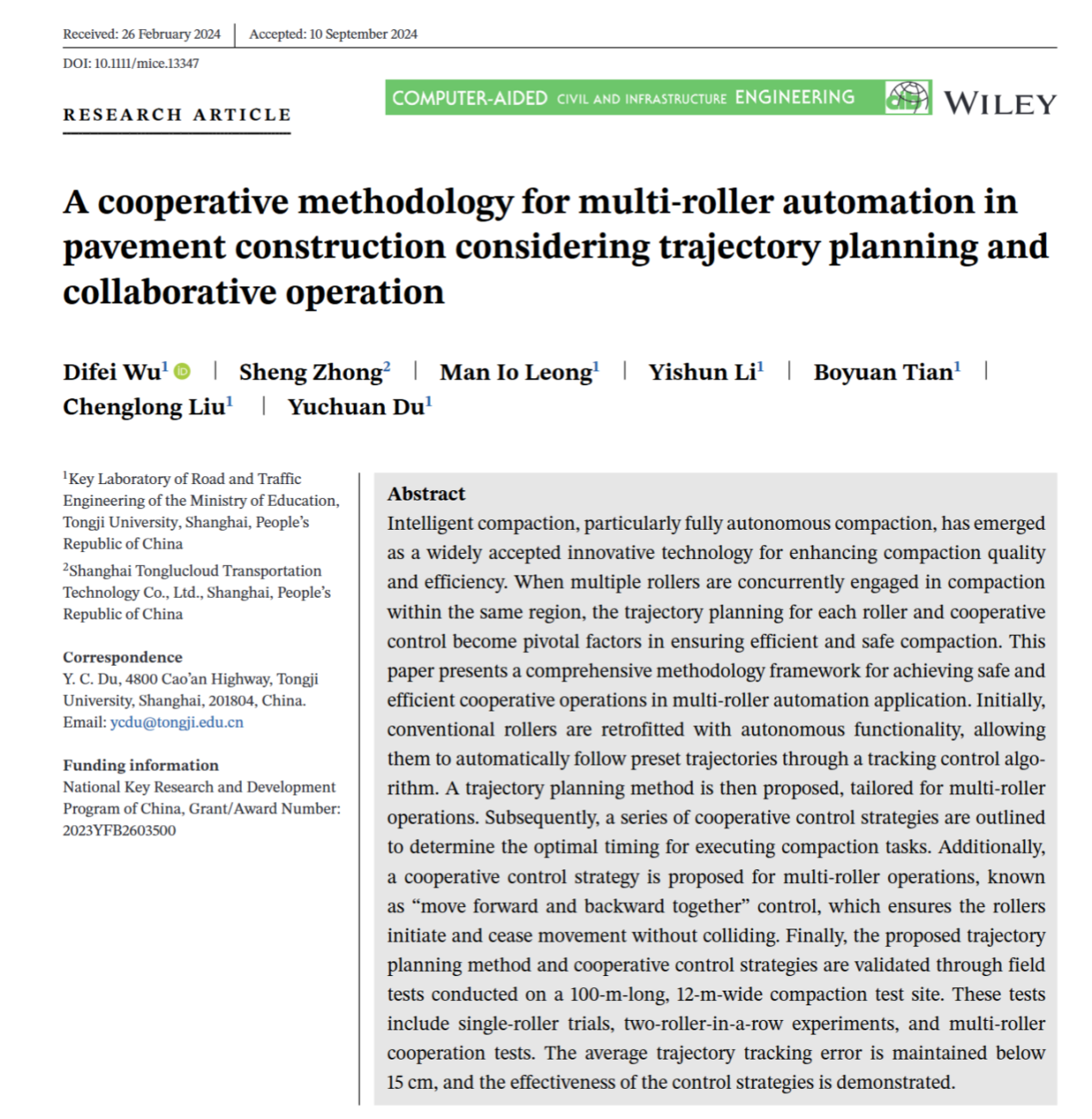 - 论文撷英|《考虑轨迹规划和协同作业的路面无人压路机集群施工协作方法》国际著名学术期刊《Computer-Aided Civil and Infrastructure Engineering》2024年9月刊发表了公司学者的论文《考虑轨迹规划和协同作业的路面无人压路机集群施工协作方法》(A cooperative methodology for multi-roller automation in pavement construction considering trajectory planning and collaborative operation)。吴荻非副研究员为第一作者...