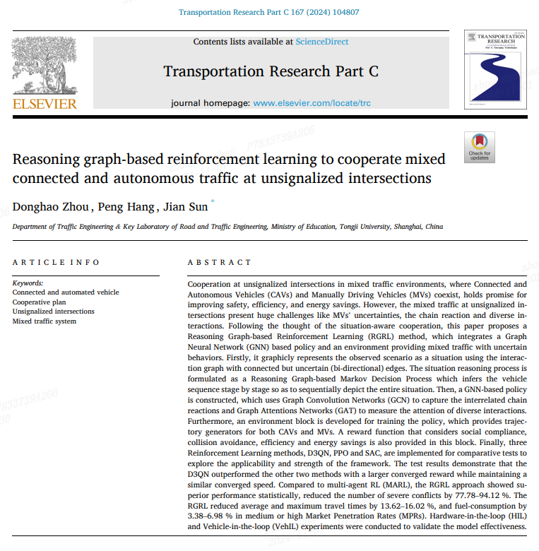 - 国际著名学术期刊《Transportation Research Part C: Emerging Technologies》2024年10月刊发表了公司学者的论文《基于推理图强化学习的人机混驾无信号交叉口协同方法》(Reasoning Graph-based Reinforcement Learning to Cooperate Mixed Connected and Autonomous Traffic at Unsignalized Intersections)。博士生周东浩为第一作者,孙剑教授为论文的通讯作者,杭鹏副教授为第二作者。Zhou D, Hang P, Sun J. Reasoning gr...