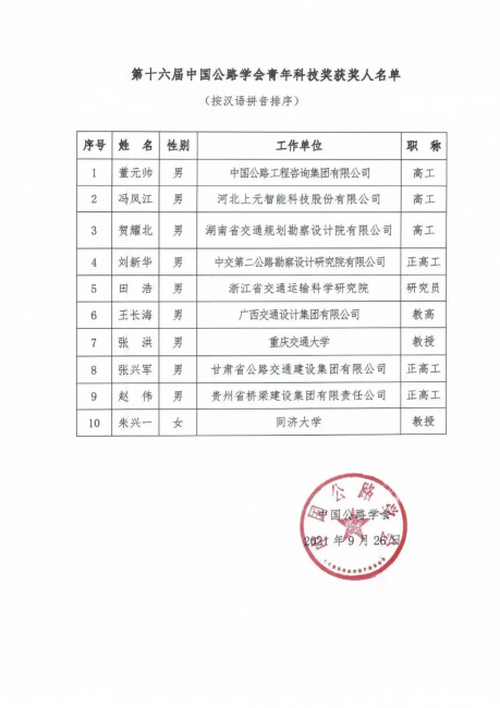 - 近日,中国公路学会发布《关于表彰“第十六届中国公路青年科技奖”的决定》,经中国公路青年专家委员会评审、中国公路学会批准,并于学会网站公示,决定授予公司朱兴一教授等十位同志“第十六届中国公路青年科技奖”...