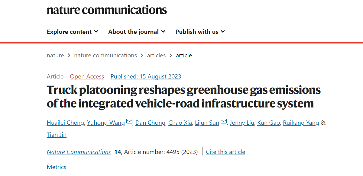 8月15日,伟德国际1946伟德国际1946孙立军教授团队与香港理工大学、密苏里科技大学、查尔姆斯大学等高校学者合作完成的研究论文“Truck platooning reshapes greenhouse gas emissions of the integrated vehicle-road infrastructure system”发表于《自然·通讯》(Nature Communications)杂志。文章通讯作者为公司孙立军教授与香港理工大学王予红教授,第一作者为两校联合培养的双学位博士程怀磊。