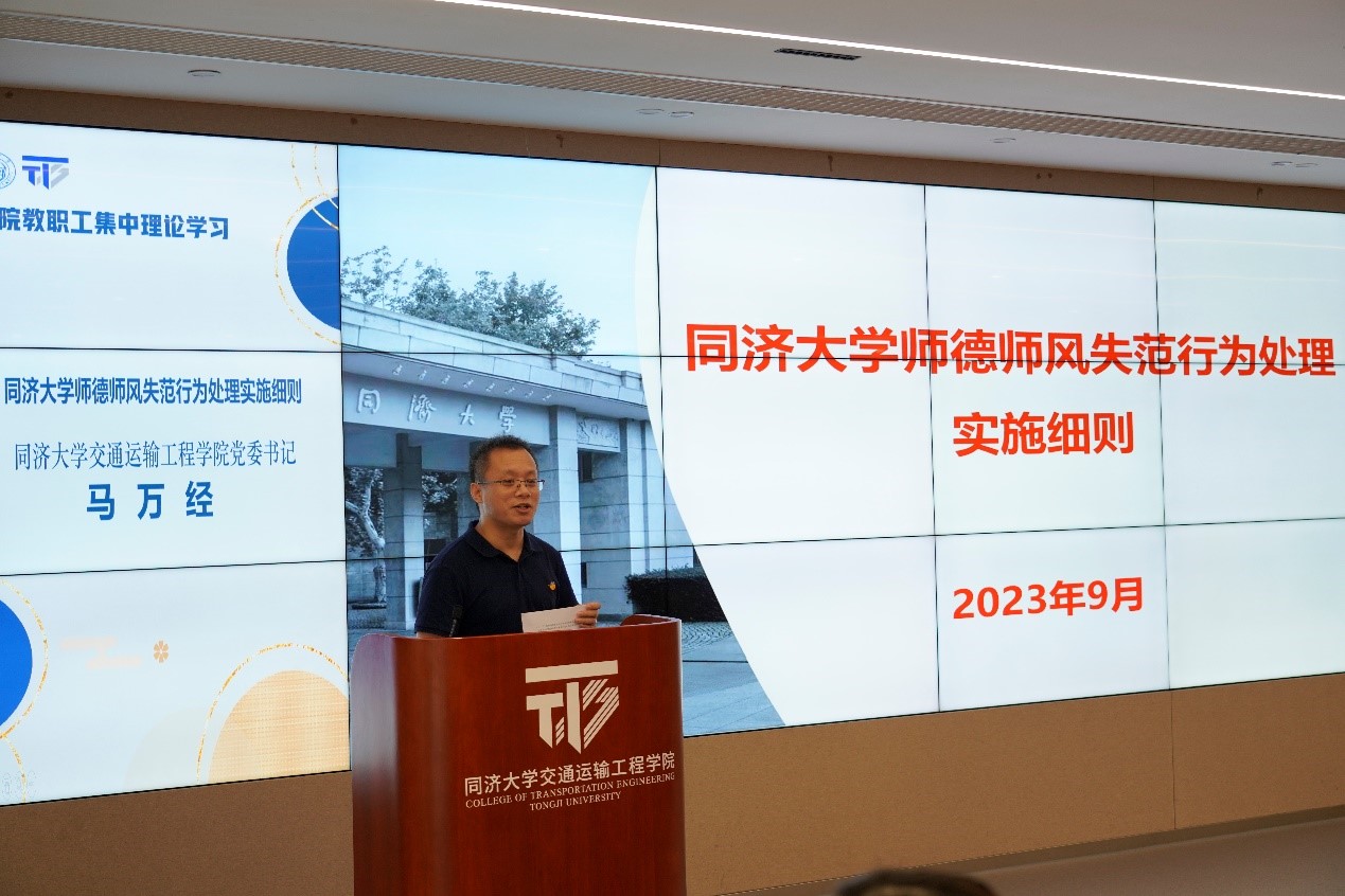 马万经书记解读了《伟德国际1946师德师风失范行为处理实施细则》,重点介绍了14条师德师风失范行为清单及5条师德师风失范行为处理措施,要求广大教师坚持正确政治方向,加强思想政治素质建设,践行社会主义核心价值观,号召全体教师自觉加强师德修养、严以律己、为人师表,落实立德树人根本任务,弘扬新时代高校教师道德风尚。