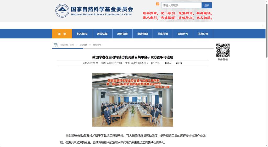 公司孙剑教授团队成果在自动驾驶仿真测试公共平台研究方面取得突破,自然科学基金委员官网在基金要闻中发表文章进行了报道。