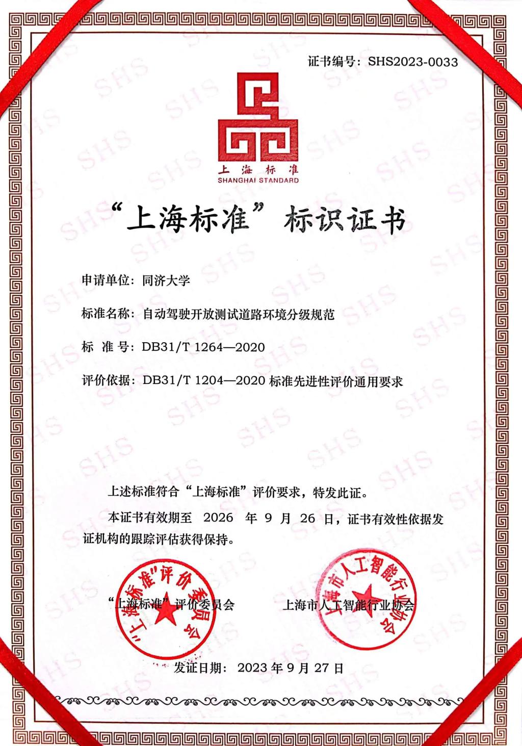 2023年10月14日,为庆祝第54届世界标准日,“上海市2023年‘世界标准日’主题活动”在浦东张江科学会堂举行。主题活动上发布了2023年“上海标准”名单。由公司孙立军教授、涂辉招教授主持编制的上海市地方标准《自动驾驶开放测试道路环境分级规范》(DB31/T 1264-2020)入选“上海标准”。