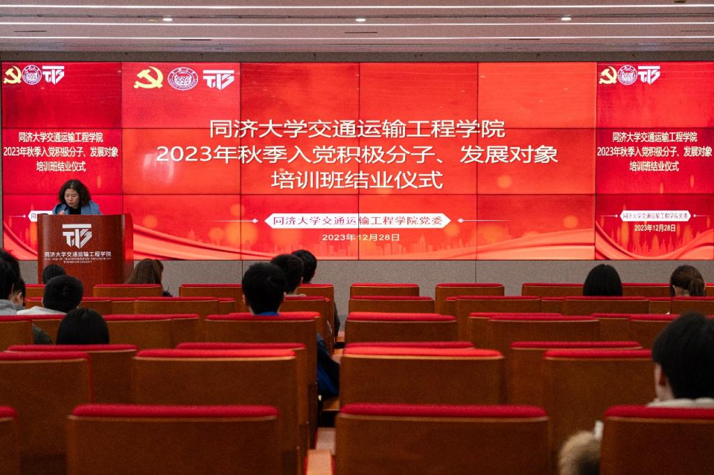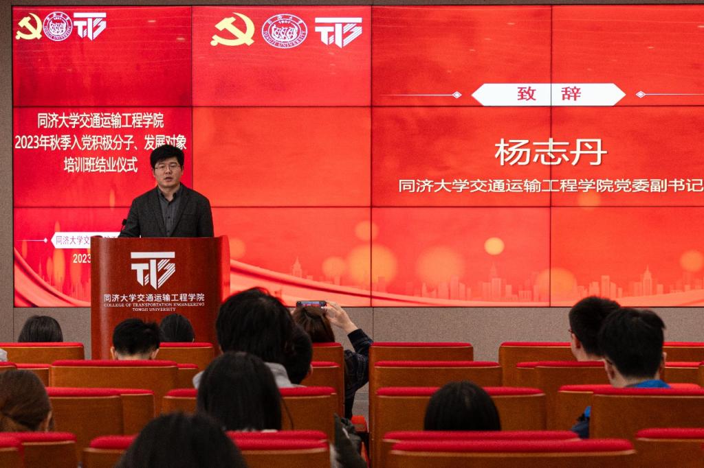 杨志丹向取得结业证书的40名入党积极分子、16名发展对象表达了祝贺和期望,强调开展集中培训是“把好党员发展关”的重要一环,更是坚定信念、筑牢根基、增强党性的“必修课”,希望各位同志:一是以此为新的起点,拿出“挤”和“钻”的精神,持续学习领会党的创新理论的科学体系,筑牢信仰之基,补足精神之钙;二是要牢记宗旨、热忱服务,作出示范、当好表率,在为师生办实事、解难题的过程中加强对广老员工群众的政治引领;三是希望学员们始终胸怀“国之大者”,接过传承同济交通精神的接力棒,成长为与强国战略、强国地位相适应,德才兼备、堪当大任的治国英才、学术大师和行业领袖。