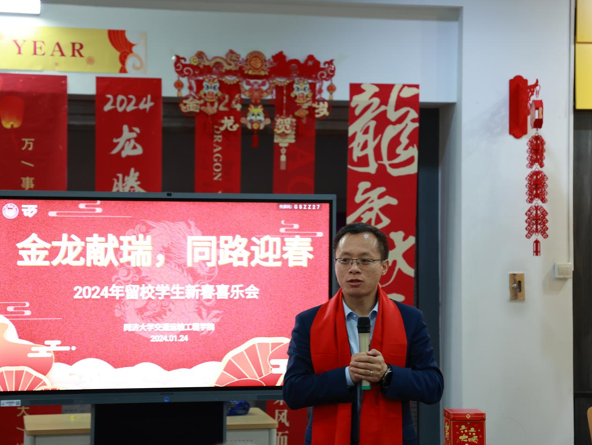公司党委书记马万经教授首先代表公司向寒假留校同学致以诚挚的新春祝福。随后,马万经书记用争做三个“龙头”勉励各位师生:首先是争做传承交通文化的龙头,无论来自哪个国家或地区,一起传承交通文化都是我们共同的责任。其次是争做突破创新的龙头,国家发展正在关键阶段,很多技术需要我们自力更生去突破,作为交通领域的员工,挑战与机会并存,需要我们大胆创新;最后是争做高质量发展的龙头,要利用好在同济的求学时光,用更扎实的奋斗、更好的身体素质、更健康向上的精神风貌,获得更光明的未来。最后,马书记再次向全体留校员工及其亲友致以节日的祝福。