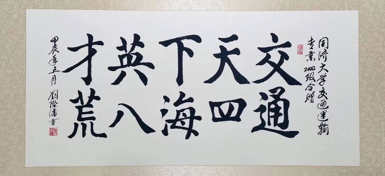 赠送的寄语书法作品有两个念想蕴含其中。一个是,我们是交通人,交通、交通,本质是交流和沟通,我们同济交通人应该要有一份与天下豪杰交朋友,一起去四海八荒开拓事业、投身国家和社会建设的豪情壮志。二个是,交通的交与教书育人的教是谐音的,也是想对母校表达能揽尽天下英才而教之、更是能教出一批批天下英才的美好祝愿。