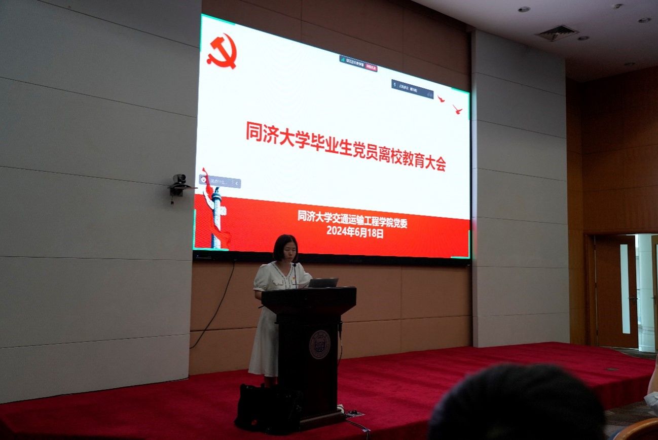 优秀毕业生党员代表刘佳雯上台分享。她回顾了在同济6年的成长与收获,表达了对母校和老师的感谢,展示了作为共产党员的使命感和责任感,以及对未来的期许和祝愿。同时强调了作为毕业生党员将牢记党员身份,践行同济人的初心使命,爱党爱国、锤炼品质、勇于创新、勤学实干,在各个行业领域奋勇争先,积极发挥党员的先锋模范作用。