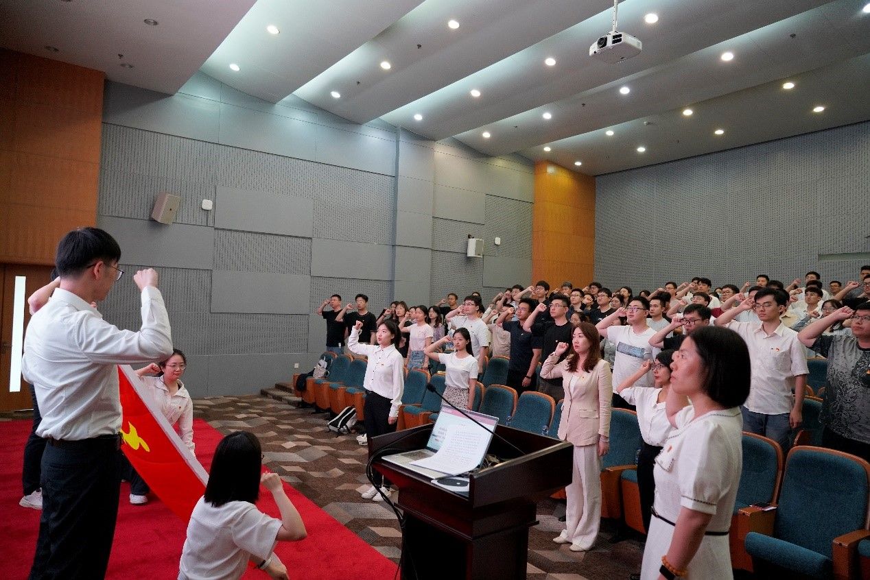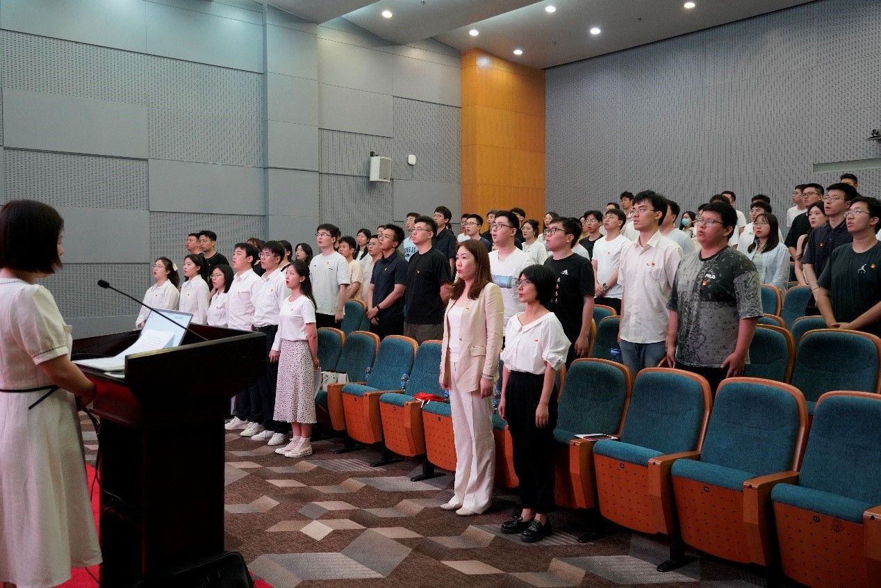 上海市优秀毕业生张玉带领全体毕业生党员重温入党誓词,党员同志面向鲜红党旗,高举右拳庄严宣誓,在铮铮誓言中重温入党初心,坚定理想信念,牢记职责使命。