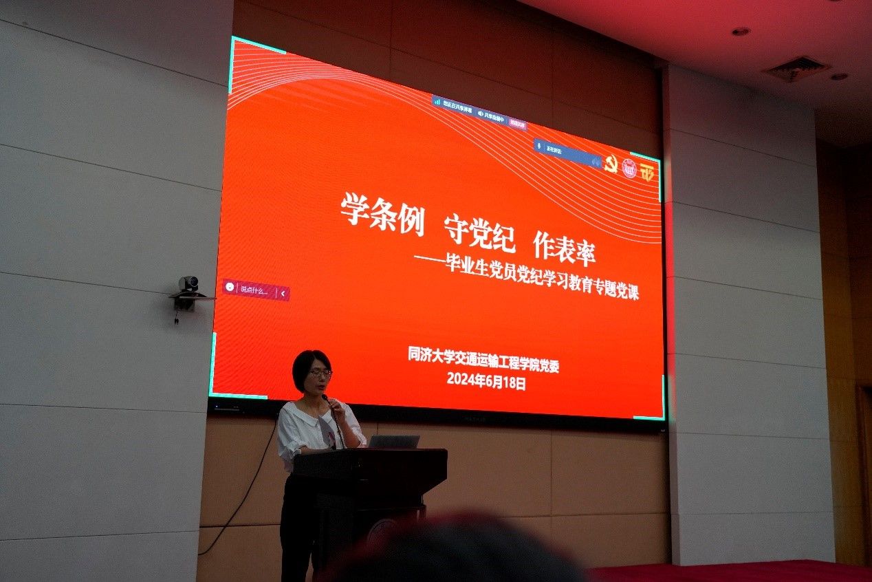王琍琍以《学条例 守党纪 做表率》为题,为毕业生党员讲授了党纪学习教育专题党课。她向毕业生党员介绍了六大纪律——政治纪律、组织纪律、廉洁纪律、群众纪律、工作纪律与生活纪律,并通过图片和视频,生动形象地介绍了党员违反党纪的主要行为类型,同时她还向毕业生党员解读了《纪律处分条例》新修订的部分条款,深入浅出地讲解了违纪的危害性与严重性,希望大家无论身在何处始终做到忠诚干净担当。
