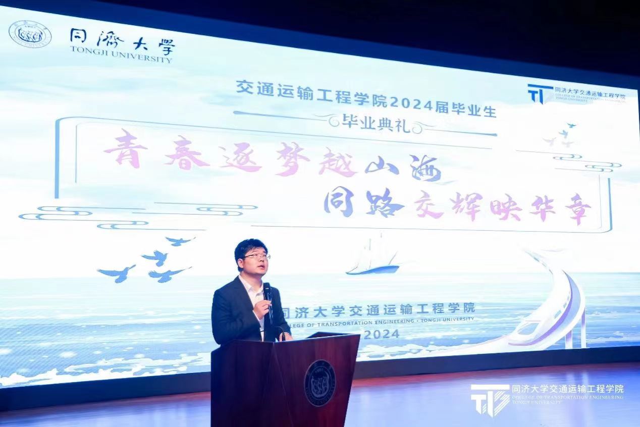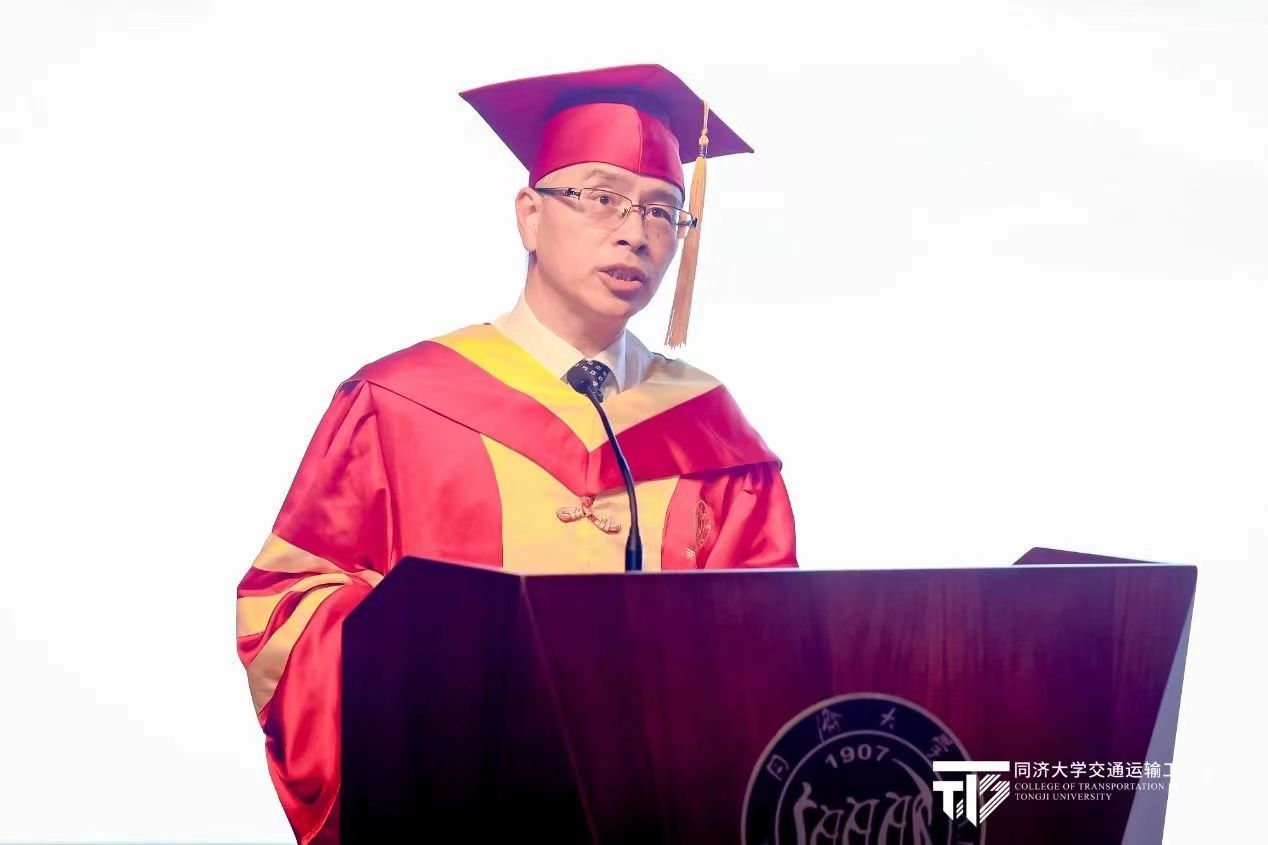 杜豫川教授作为导师代表发言,他希望大家有“仁心”,心怀仁慈、推己及人,与人通感、与人共情。同时,要判断真知并不断学习,做一个有力量的仁者,保持“同济天下,崇尚科学,创新引领,追求卓越”的初心不改,共同成就“人民满意、保障有力、世界前列”的交通强国事业。