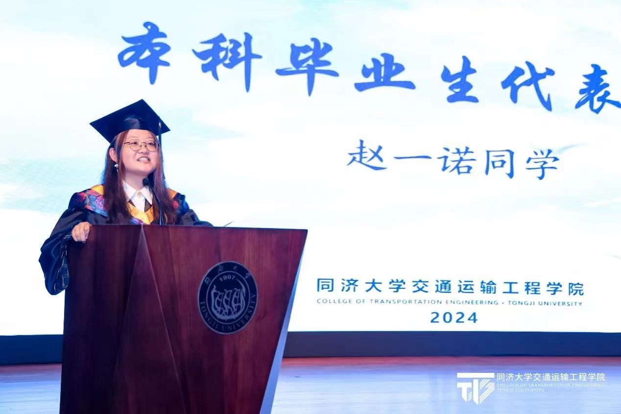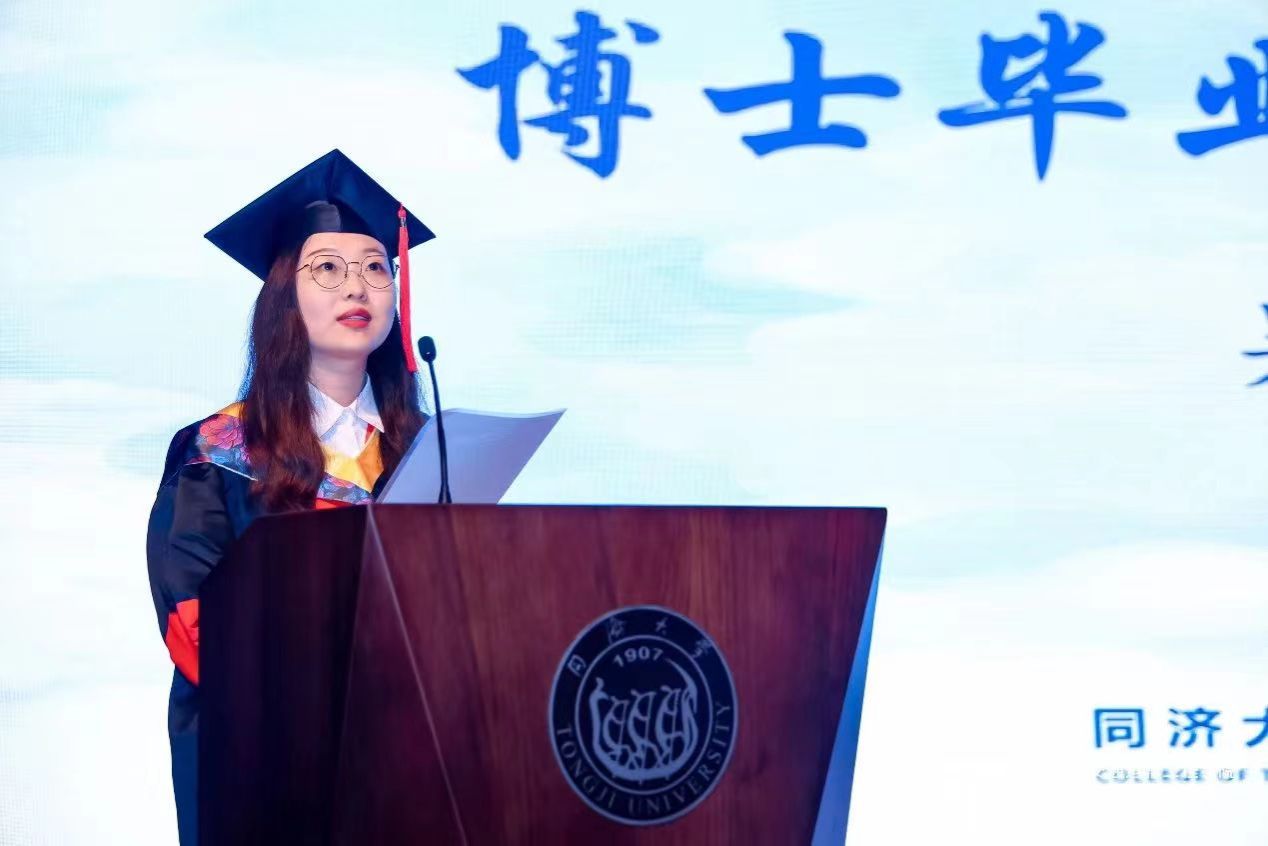 博士研究生吴冕同学、本科毕业生赵一诺同学作为毕业生代表上台分享自己和同济的故事以及对未来的期许。吴冕同学希望大家能够怀揣赤诚之心,牢记“思行合一,交融成艺”的使命,倾尽所学,回报社会;赵一诺同学讲述了她主动放弃推免资格,决定前往西部地区支教的经历,让青春在祖国和人民最需要的地方绽放绚丽之花,努力做到追求卓越,通达世界。