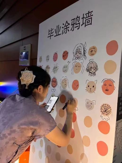 在艺嘉楼南门大厅,笔墨手写祝福签到墙是毕业生们表达情感的另一片天地。在这里,笔墨不仅仅是书写工具,更是传递心声的媒介。毕业生们拿起笔,在墙上留下自己的手写祝福,每一笔都充满了情感和力量。在笔墨的流转中,毕业生们对未来的美好愿景汇聚成一片希望的海洋,为即将开启的新生活注入了无限动力。镜头前,摄影师将毕业生们的璀璨笑颜定格在多彩的拍照框中。
