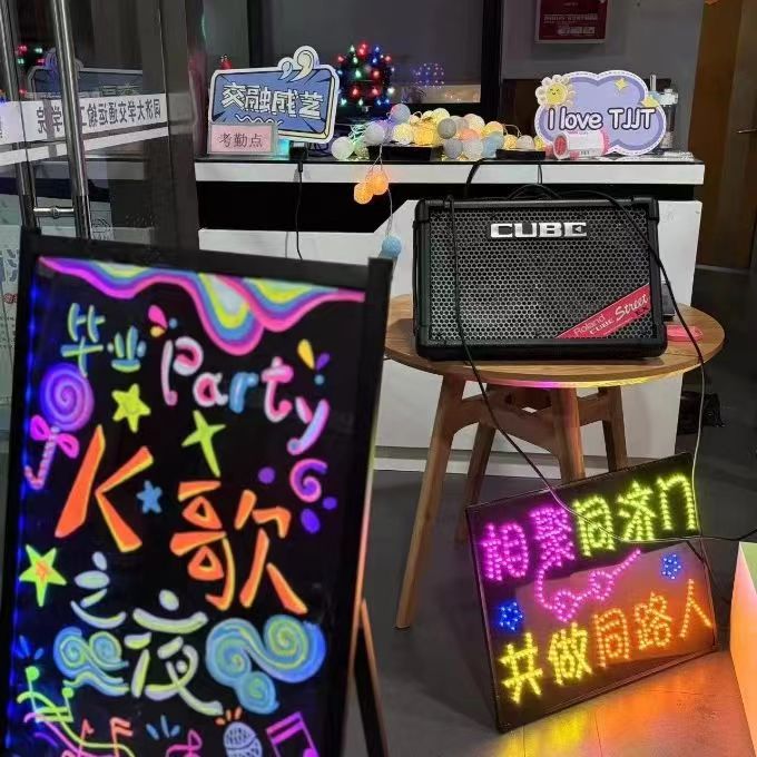 同学们在DIY区涂鸦创作了属于自己的毕业文化衫;毕业集市为同学们提供了一个物品循环和分享的平台;桌游区在露营小灯的映照下温馨美好,同学们的友谊地久天长……