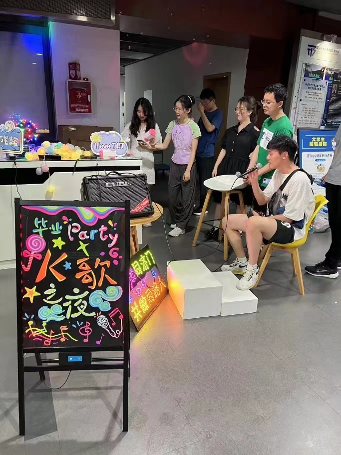 活动现场,“毕业快乐”合影背景墙和毕业涂鸦墙前留下了同学们青葱岁月的美好身影;K歌区成为大学时光的留声机,寄托了同学们的追忆和向往;游戏区的投壶和校园美景拼图游戏更为大家带来了无尽的欢声笑语。