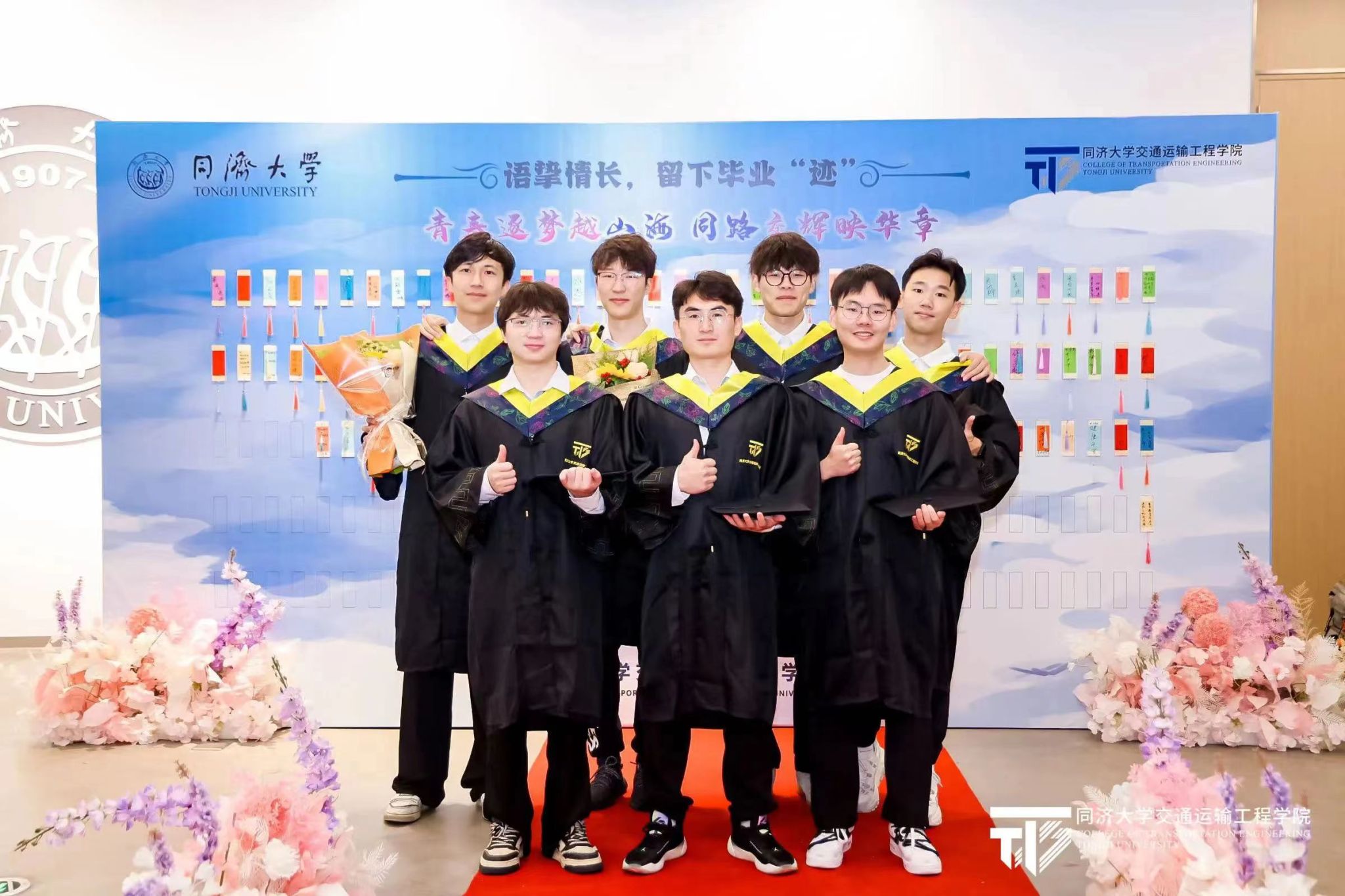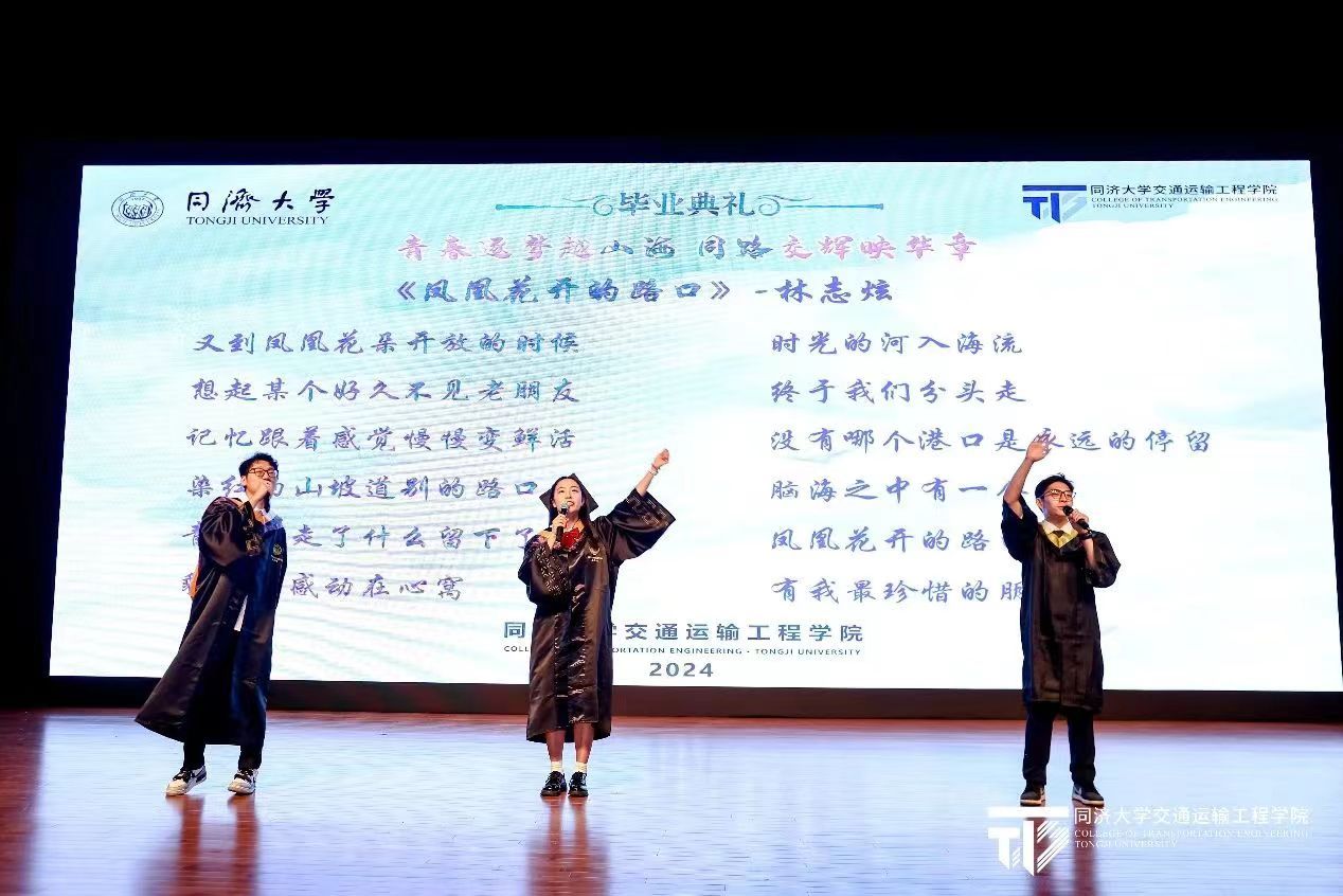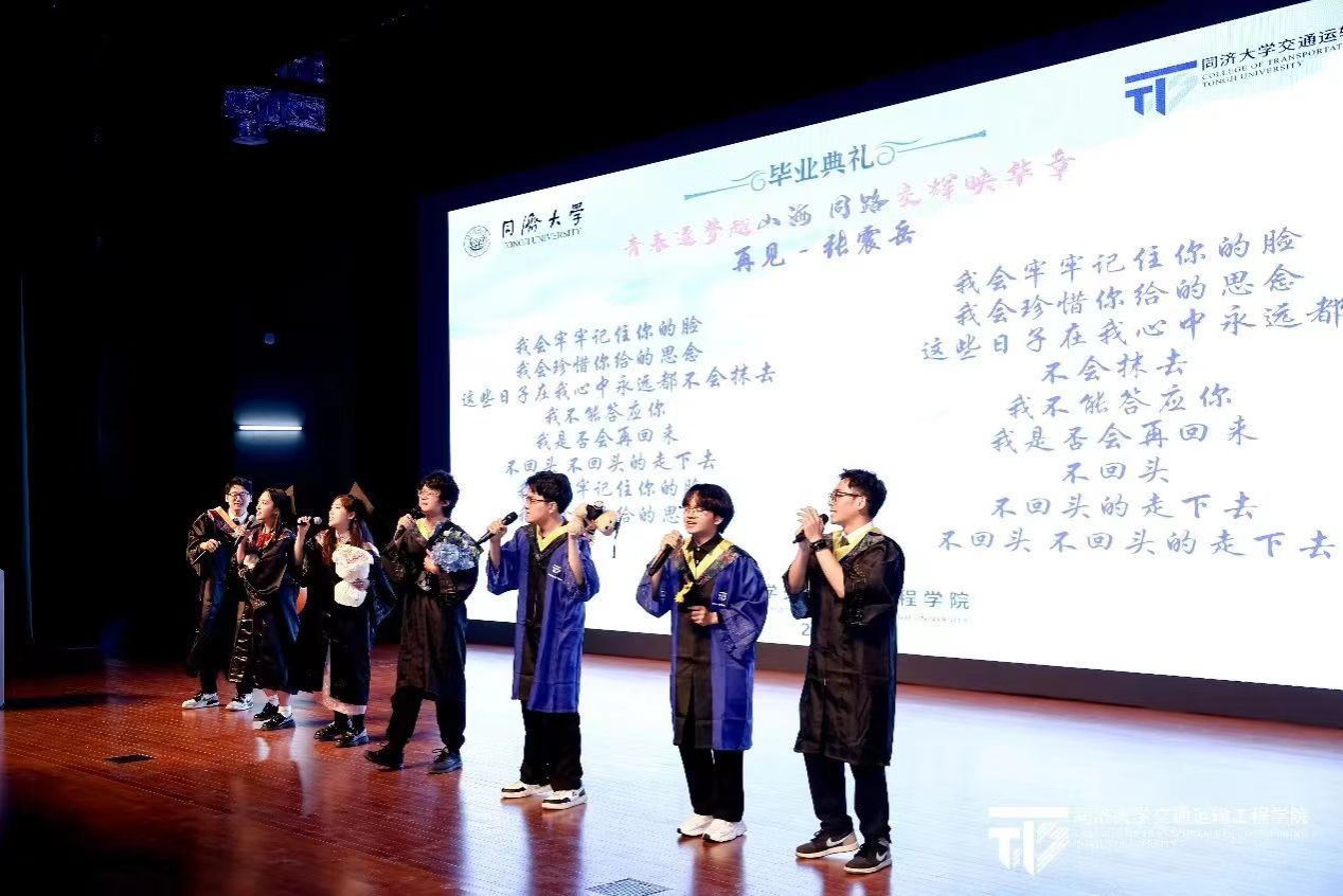 在熟悉的旋律中,李昌裕、何珊、吴贤荣、袁思琪、栗晨皓、王翔舜、陈灿七名同学为大家带来了毕业歌曲串烧《凤凰花开的路口》+《七里香》+《再见》,串联起在同济交通的回忆与成长,用歌声诠释着青春的美好与不舍。