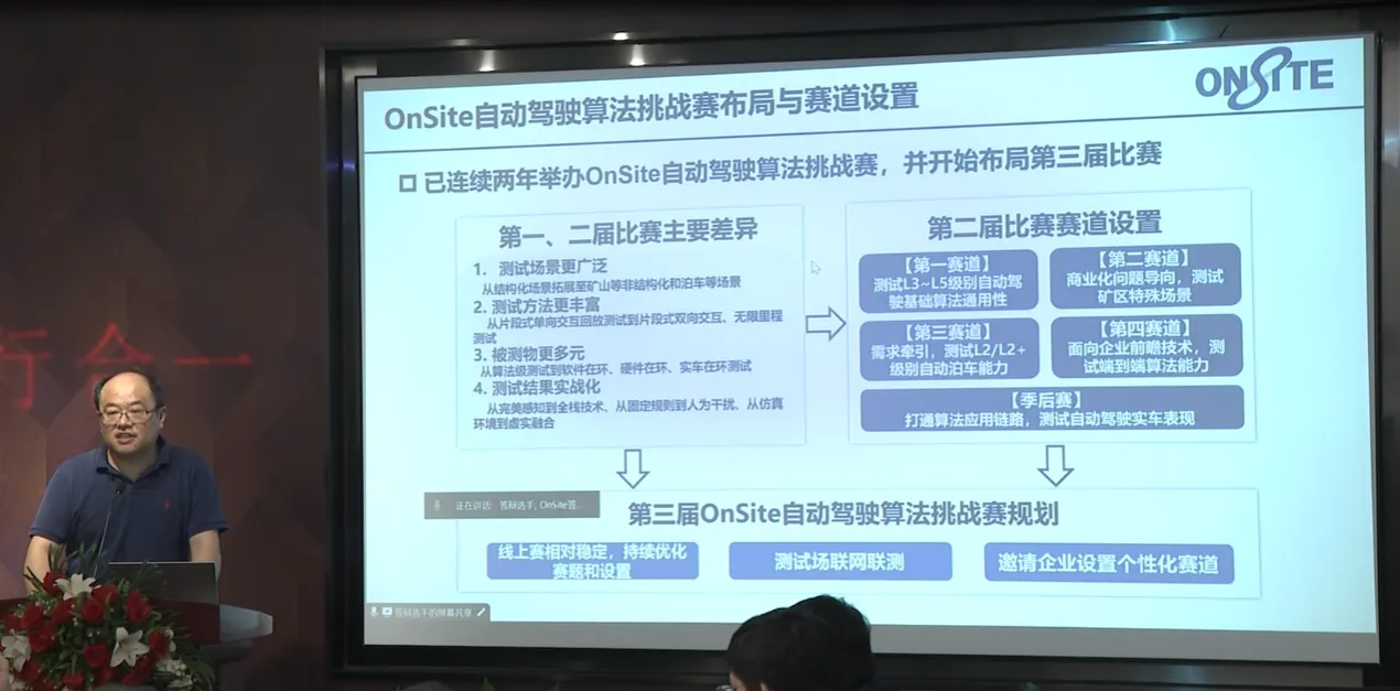 随后,OnSite平台技术委员会代表孙剑教授对本届比赛的基本情况和答辩规则进行了介绍。孙剑教授围绕赛事的关键时间节点、各赛道选手报名情况、参赛队伍技术问题总结、算法优化方向等赛事基本状况进行了汇报。其根据选手的表现,总结出较于第一届赛事,此次OnSite自动驾驶算法挑战赛具有测试场景更广泛、测试方法更丰富、被测物更多元、测试结果实战化等特点,并对第三届OnSite自动驾驶算法挑战赛规划进行介绍。最后对此次答辩的审查内容、各支队伍的答辩顺序及答辩注意事项进行了介绍。