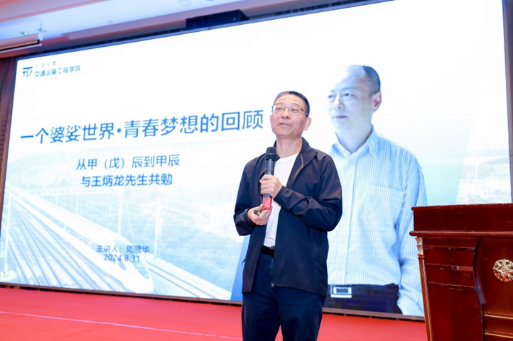 周顺华教授以“一个婆娑世界·青春梦想的回顾”为主题,引领大家重温与王炳龙教授共事的光辉岁月。周老师以“青春与梦想”为引子,唤起了大家对往昔时光的共鸣;随后细数王老师职业生涯的点点滴滴,通过鲜活案例,生动展现了王炳龙教授在科技创新方面的突破、工程实践中的成就、以及教书育人上的心血,最后以“世上没有一次走完的路,职业的专注是一朵清新的莲花”为寄语,表达了对王炳龙教授职业精神的崇高敬意,也寄托了对他未来生活的美好祝愿。