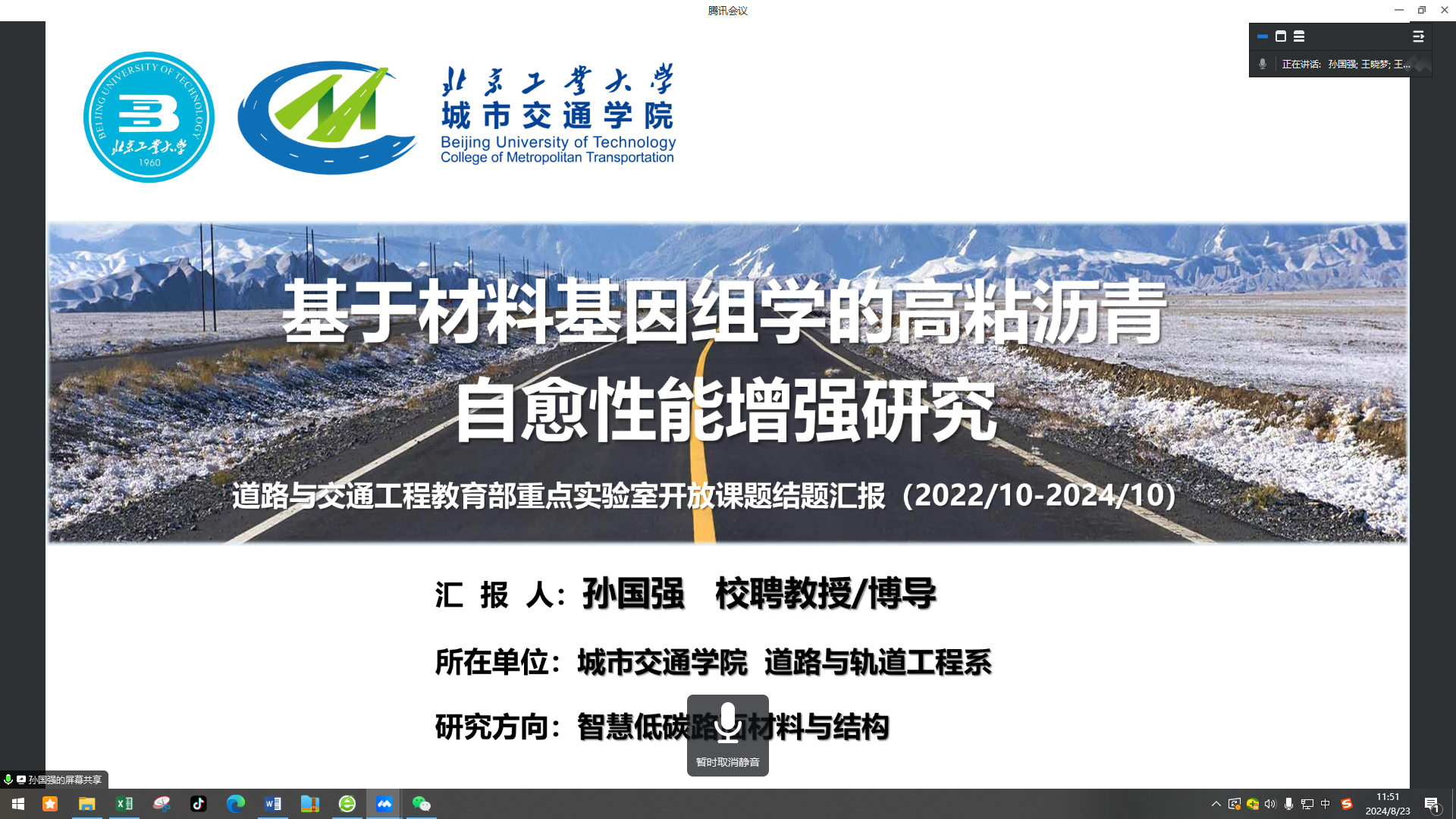 8月23日上午,“道路与交通工程教育部重点实验室2024年开放课题汇报会”以视频会议形式线上举行。重点实验室副主任王雪松教授、重点实验室副主任孙大权教授、公司副经理朱兴一教授、交通工程系段征宇副教授组成专家组成员,审议了2022年度开放课题结题报告、2023年度开放课题中期报告,并对2024年度开放课题申请书进行了评审。会议由王雪松教授主持。
