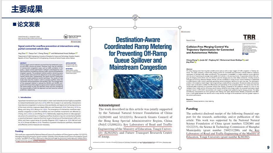 上海理工大学章程博士主持的“网联环境下快速路合流区交通运行风险预判与主动防控”面向网联车辆交通环境,提出面向主线优先的合流区车辆间距控制技术,有效预防合流区交通事故、提升合流交通秩序与通过效率;创建预防匝道排队溢流的快速路出入口双控技术,有效降低出入口匝道溢流风险;提出基于网联车辆实时位置数据的交通控制模型,有效避免快速路周边路网死锁现象。研究成果对于提升城市快速路交通运行安全高效可靠、推进智能网联汽车典型场景应用,具有重要的理论意义和应用价值。依托课题已发表SCI论文3篇,授权专利2项,申请发明专利2项,出版专著1部。