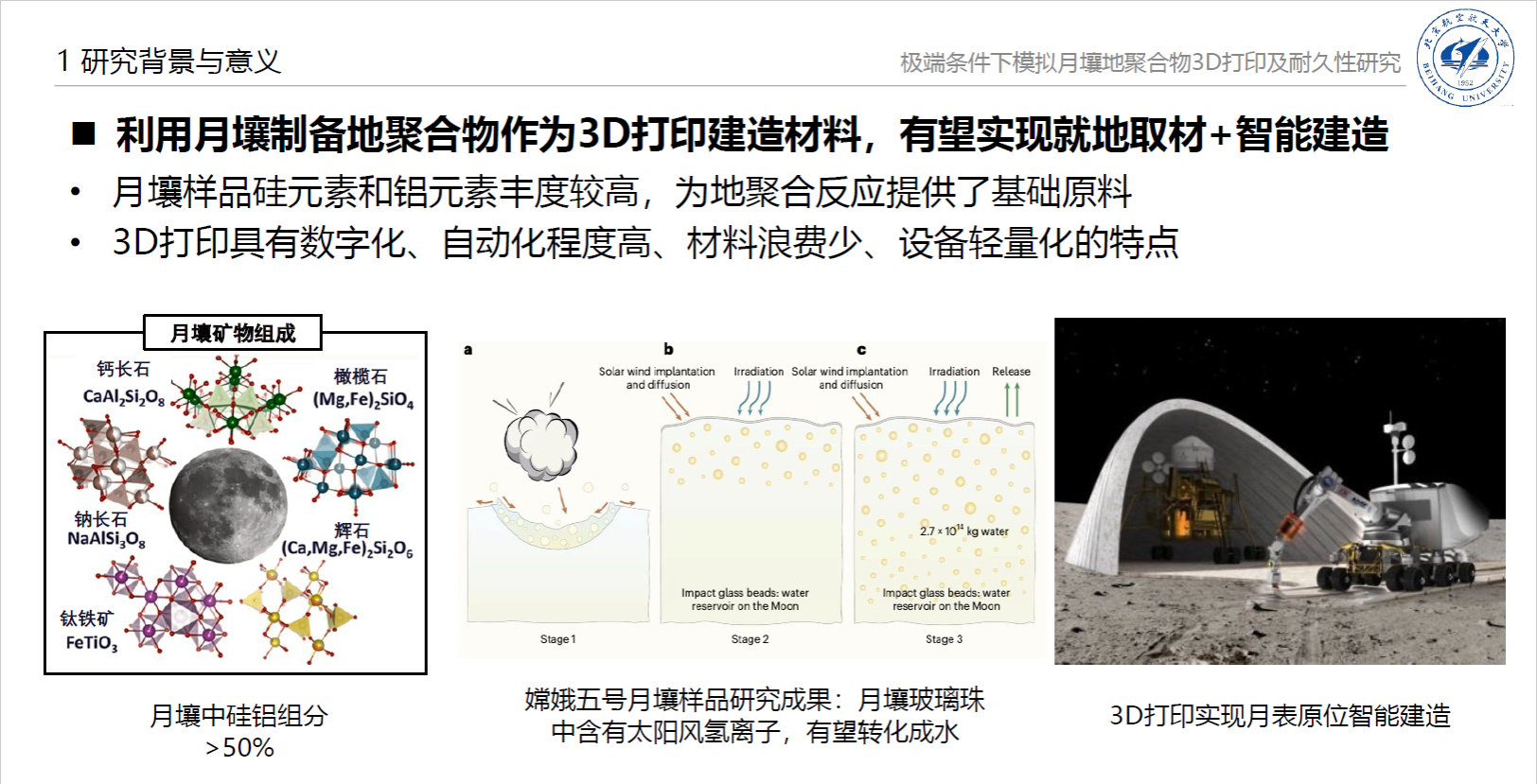 北京航空航天大学周思齐博士主持的“极端条件下模拟月壤地聚合物3D打印及耐久性研究”聚焦月壤原位利用与智能建造技术,基于BH-1模拟月壤地聚合物制备3D打印墨水,建立了材料配合比设计-流变参数-3D打印工作性的协同预测和调控方法。同时考虑月面微陨石冲击极端环境,利用碳纳米纤维显著提升模拟月壤地聚合物的抗冲击极限能量,最高可达47%。研究成果实现了模拟月壤地聚合物3D打印工作性的“零外加剂”调控,显著提高了模拟月壤的原位利用率,为月面道路交通基础设施建造材料和工艺提供理论技术支持。依托该课题,已衍生相关项目3项,发表SCI论文3篇、EI论文1篇。