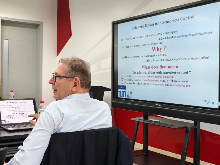 在互动提问环节,现场气氛热烈。师生积极交流,内容涉及HF无传感器控制切换、过采样如何提高无传感器控制、ChatGPT在电力电子领域应用等各种问题。Kennel教授从电机特性、实现难度、控制特点、噪声大小等多方面来详细解答同学所提出问题,使同学们对交流电机无位置传感器控制未来发展有了更深刻的认识和理解。