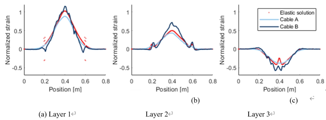 为验证光纤传感器对静态应变模态的捕捉能力,制备了埋入不同类型光纤传感器的沥青梁样本,并通过四点弯曲试验施加静载荷。A型传感器由于施工过程中的高温影响,在捕捉局部应变方面与理论解之间存在显著偏差。而B型传感器在相同条件下表现出较高的应变捕捉精度。但即使在埋入过程中经历了高温,两类传感器的归一化应变在总体分布上与理论结果一致。