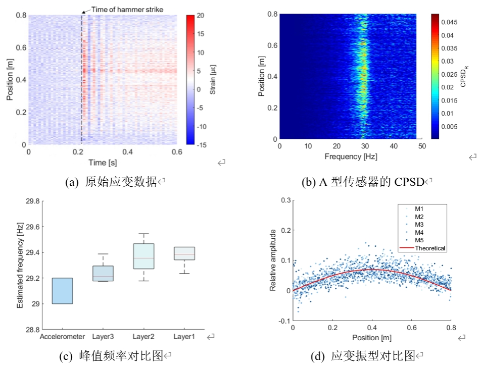 3) 冲击荷载试验:锤击沥青梁,通过测得的动态应变开展CPSD分析,将分析得到的应变模态结果与传统加速度计、理论振型对比,验证基于CPSD方法的应变模态测量能力。