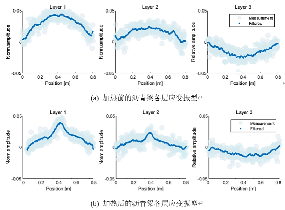 研发了基于分布式光纤的沥青铺面结构应变模态测量方法,充分利用高空间分辨率、高密度的应变数据提升沥青铺面结构应变模态频率与振型的测量效果,并能灵敏反映沥青结构局部结构特性变化。