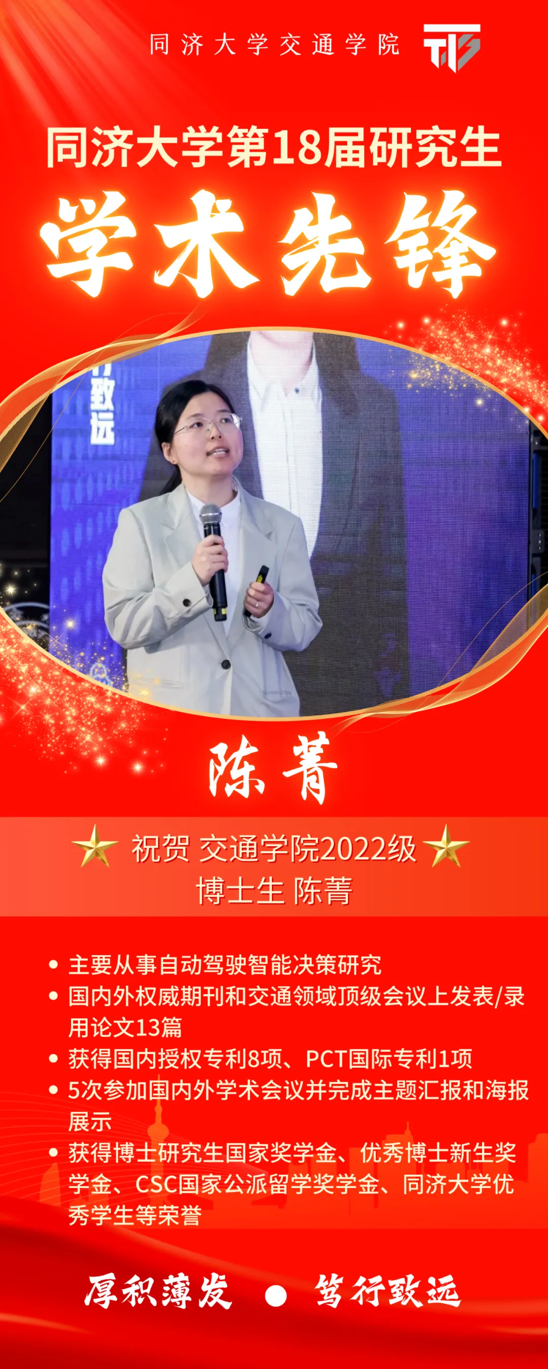 主要从事自动驾驶智能决策研究,在《Transportation Research Part C: Emerging Technologies》《Computer-Aided Civil and Infrastructure Engineering》《中国公路学报》等国内外权威期刊和交通领域顶级会议上发表/录用论文13篇,其中2篇论文为ESI高被引论文,最长高被引在榜9期;注重实践和工程落地,获得国内授权专利8项、PCT国际专利1项,相关智能决策技术应用于智慧停车系统,实现停车效率和驾驶舒适性提升;积极参与学术交流,5次参加国内外学术会议并完成主题汇报和海报展示,获得中国汽车工程学会首届全国博士生学术论坛优秀海报奖;博士在读期间,获得博士研究生国家奖学金、优秀博士新生奖学金、CSC国家公派留学奖学金、伟德国际1946优秀员工等荣誉。