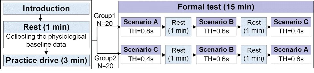 本文搭建了L3级自动驾驶仿真平台并开展紧急接管驾驶模拟实验(图1),其中的紧急接管事件由相邻车道车辆紧急切入触发(图2)。驾驶人需要在自动驾驶模式下完成非驾驶任务,并在系统发出接管请求时接管车辆控制。通过眼动仪和皮肤电反应生理仪监测驾驶人接管过程中的生理反应。实验通过随机分组和场景顺序的反向设计,避免顺序效应;同时,通过设置随机的非接管切入事件减弱驾驶人在实验过程中的学习效应(图3)。