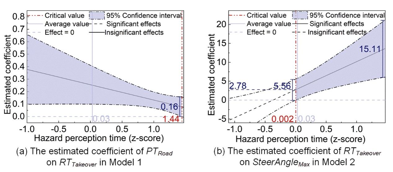 进一步通过Johnson-Neyman分析,本文确定了接管绩效指标间关系从显著变为不显著的危险感知时间取值临界点,该值代表了加强新手驾驶人接管绩效时提升危险感知能力的上限。从接管反应到转向行为的过程中,接管反应时间对最大方向盘转角的影响显著性在HPT=0.002时发生变化(图5(b))。根据该临界值,39.8%危险感知能力较弱的驾驶人的最大方向盘转角与接管反应时间正相关;而对于60.2%危险感知能力较强的驾驶人,其转向行为不再受到较长的接管反应时间的显著制约。当危险感知能力提高至这一临界值以上,即使接管反应时间稍长,驾驶人也不太可能急转方向盘。因此,对于39.8%危险感知能力低于临界值的驾驶人仍需要提升其危险感知能力。