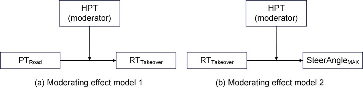 本研究构建了两个调节效应模型,其中HPT为驾驶人的危险感知时间,PTRoad为第一次看道路的时间,RTTakeover为接管反应时间,SteerAngleMAX为最大方向盘转角(图4)。当危险感知能力不同时,紧急接管过程中驾驶人第一次看道路的时间对接管反应时间的影响以及接管反应时间对最大方向盘转角的影响会发生变化。当驾驶人的危险感知能力较强时,接管反应时间对最大方向盘转角的影响不再显著。