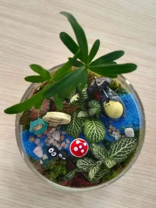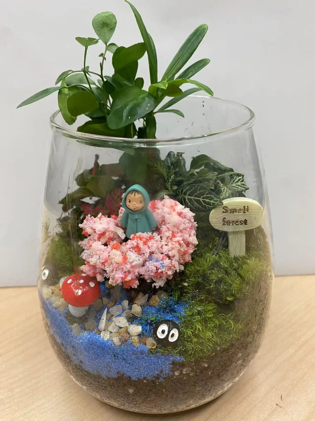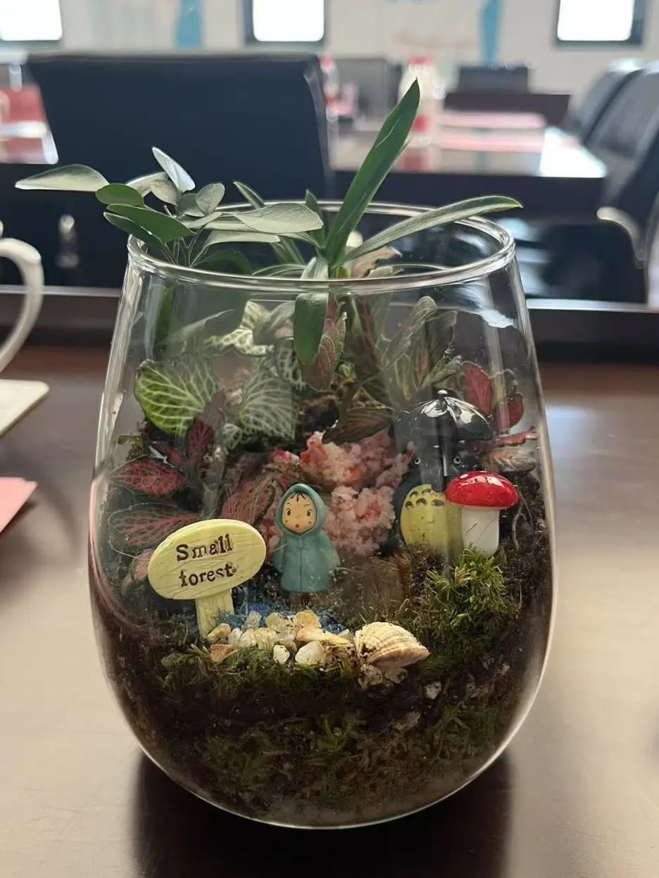 活动现场,苔藓、多肉植物、砂石、迷你摆件、玻璃瓶等材料整齐摆放,静待教职工们施展巧思。专业老师以生动的讲解揭开活动序幕,从微景观的构图美学到植物养护的实用技巧,辅以娴熟的示范操作。随后,各位教职工化身“自然设计师”,将绿意盎然的苔藓、形态各异的多肉绿植与精巧的装饰品巧妙搭配,精心缔造出属于自己的微观世界。一方方玻璃容器中,绿意蔓延、春色跃动,既有自然的清新,又融入了独特的艺术气息。活动中,大家或专注构思,或交流心得,欢声笑语间,一件件充满个性的微景观作品陆续诞生。