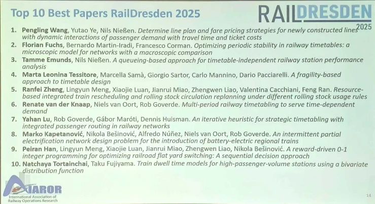 本次会议共收录公司师生研究成果10项(含论文9篇、海报1项),创历届参会成果数量新高。会议期间,公司师生在各分会场积极进行论文宣讲与海报展示,研究成果广受认可与好评。其中,公司与德国亚琛工业大学合作的论文《Determine Line Plan and Fare Pricing Strategies for Newly Constructed Lines with Dynamic Interactions of Passenger Demand with Travel Time and Ticket Costs》从众多投稿中脱颖而出,荣获大会最佳论文第一名。
