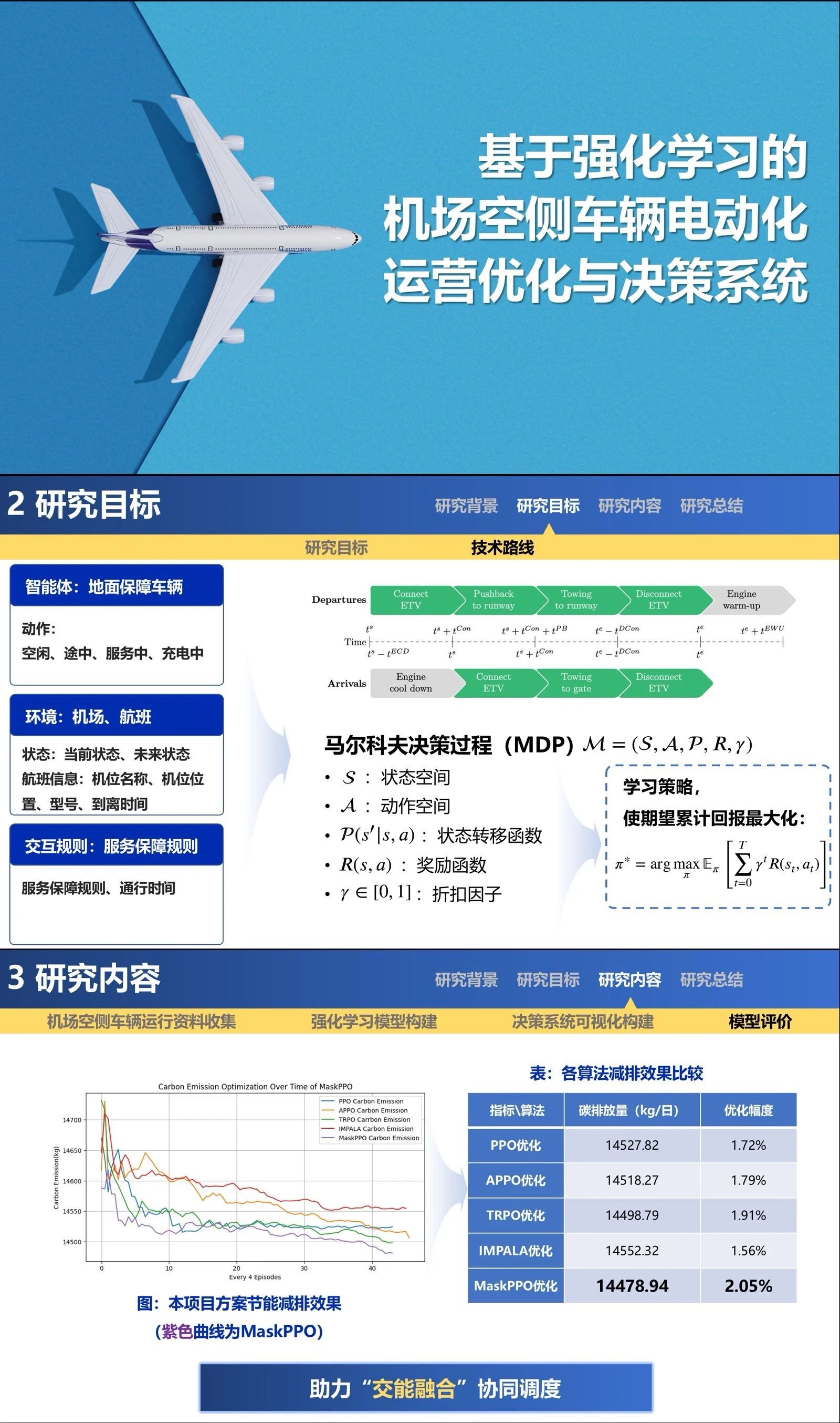 获奖团队:由邢莹莹老师担任指导教师,周淼同学担任负责人,王奉德、何逸轩、胡屹舟和郭天资同学参与的“基于强化学习的机场空侧车辆电动化运营优化与决策系统”项目