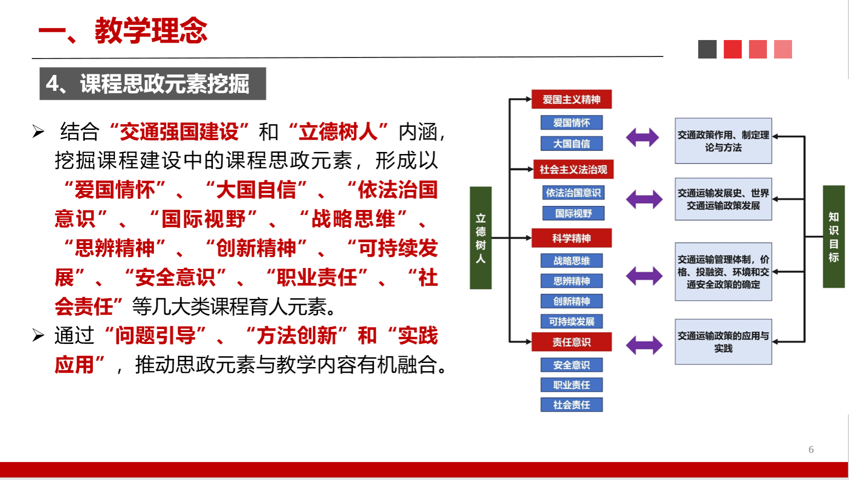 课程简介:“交通运输政策”是交通运输专业的核心课程之一,旨在培养成人员工系统战略思维、思辨能力和统筹意识。课程紧密结合运输政策法规与实际应用,重点聚焦我国铁路运输市场规制、运输资源有效供给与运输环境可持续发展等领域的政策内容。通过案例分析与辩证思维的训练,培养员工的爱国主义精神、社会主义法治观、科学精神与责任意识,提升员工在交通运输领域的决策和执行等职业能力。2024年“交通运输政策”课程入选上海公司课程思政示范课程。