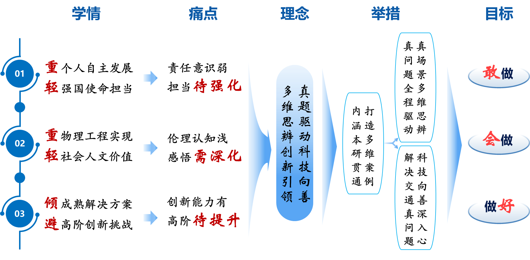 针对交通领域研究生普遍存在的“重个人发展轻强国使命、重工程实现轻人文价值、重成熟方案轻创新挑战”的倾向,课程团队深入剖析行业痛点,将“技术漏洞可能危及生命安全”“工程创新必须服务公共利益”的认知,通过真实案例具象化,引导员工超越单纯技术思维,在“感知-传输-应用”全链条中植入责任基因。