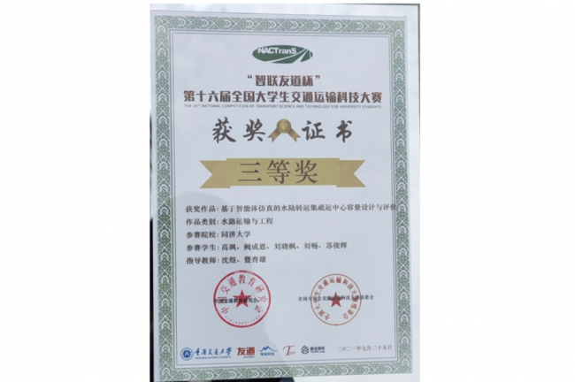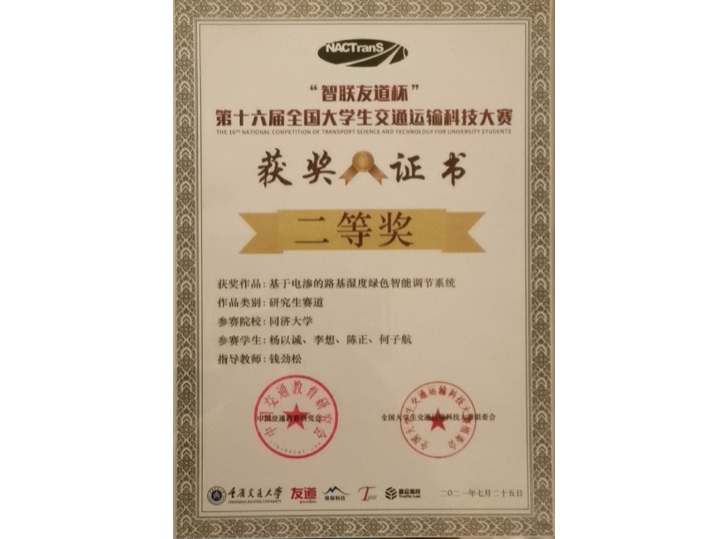2021年7月24日-25日,由中国交通教育研究会主办,委托教育部高等公司交通运输类教学指导委员会评审、重庆交通大学承办的“智联友道杯”第十六届全国老员工交通运输科技大赛在重庆举行。公司推荐的参赛作品在大赛中喜获佳绩,共有6个项目获奖,其中一等奖、二等奖、三等奖各两项。公司员工的参赛作品和现场表现得到专家评委的高度评价。