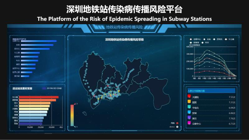 本项目基于深圳通数据,综合分析影响地铁站传染病传播风险的各个因素,结合传染病传播模型,利用熵权TOPSIS评价方法,对深圳市地铁站点进行评估及风险分级,建立了风险评估可视化平台与面向乘客的风险提示微信小程序。研究结果为地铁运营与管理部门的日常疫情防控提供理论基础,有助于保障疫情防控常态化背景下的市民安全出行。