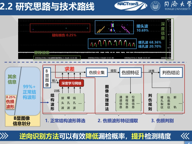 本项目旨在利用现有超声B显探伤硬件,开发基于深度学习的钢轨智能判伤系统,用智能系统取代人工作业。项目针对B显结构波形的特点,创造性地提出了“逆向识别”的判伤思路,有效改善了现有研究中存在漏检的不足。研究成果获得国内外专家的初步认可,对于降低现场作业难度,提高铁路运维智能化程度具有重要意义。