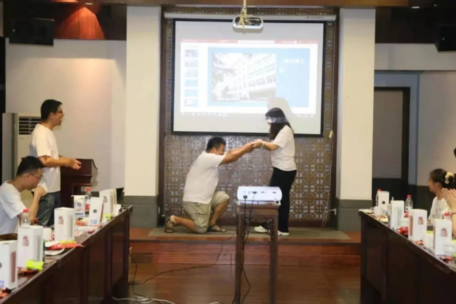 为互动环节获胜者颁奖,二人既为同学又是夫妻,家庭地位一目了然