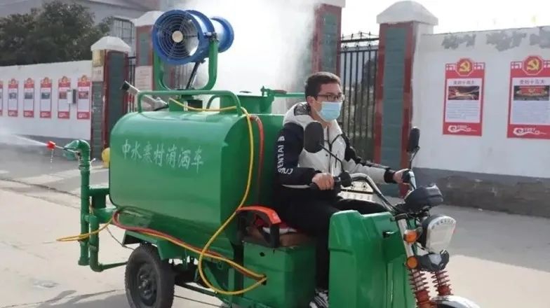 马明杰驾驶降尘雾炮消洒车为村街消毒防疫