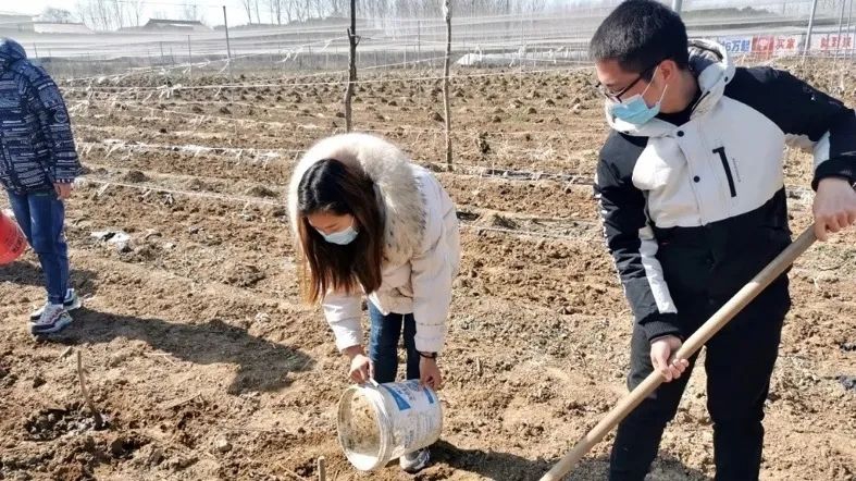 马明杰(右一)等老员工到村无花果基地栽种果苗