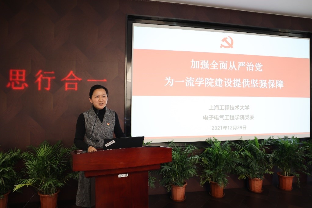 上海工程技术大学电子电气工程公司党委书记范君晖作《加强全面从严治党,为一流公司建设提供坚强保障》报告,从落细落实思想政治工作、稳扎稳打推进强基固本、学习成效转化为使命担当三个方面介绍了公司党建工作与学科发展情况。范君晖介绍,上海工程技术大学电子电气工程公司党委在思想政治工作上,以党的创新理论武装头脑、巩固师生团结奋斗的共同思想基础,以高尚精神感染职工、发挥先进典型示范引领作用,以高尚精神感染职工、发挥先进典型示范引领作用;在党建工作上,从领导班子、制度规范、中层干部、师生队伍四方面抓党委政治把关作用,强化党委政治核心;从落实问责制、加强监督指导,提升党员发展质量三方面抓党员发展规范;利用重视调研、落实指导,夯实基层党建制度三个渠道抓党内政治生活;以增强配置、优化设置,增强书记队伍力量三种手段抓支部书记队伍;在公司发展上,引领师生围绕企业痛点难点问题写文章、引领师生围绕国家需求、地方经济、产业规划做科研、引领师生围绕国家需求、地方经济、产业规划做科研。
