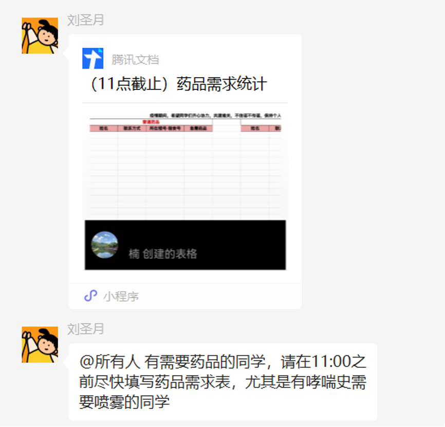 朋园4号楼的物资需求无法及时得到保障,因此公司党员干部积极号召楼内本院的党员同学开展楼内无接触物资互助,越来越多的同学贡献出自己多余的物资,物资储备表格不断拉长,数据不断更新,这是团结和奉献在封闭的寝室间悄然的传递。