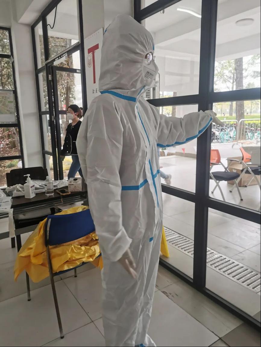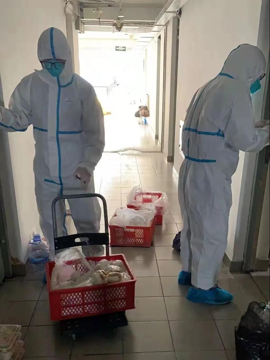 在公司的广泛倡议和严峻的抗疫形势下,交通学子纷纷化身为穿梭于楼宇间的大白和小蓝,为保障每一楼层同学的基本生活需要,奔波在物资运送的路上。防护服遮面,掩不住同学们战疫的坚毅;汗水滴下,压不倒新时代青年扛起使命的肩。