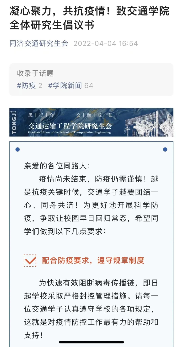 娱乐活动也一个都不能少!研究生会、员工会还举办了创作视频大赛“春暖花开,FUN肆笑”,玩转脱口秀尽情展现才华,还有面向全校的交友活动“有疫说益,樱为有你”,以及宿舍楼内同学们自发组织的“跟唱大赛”……什么都封不住我们交通学子的才华,充满希望才能更加乐观地抗击疫情!