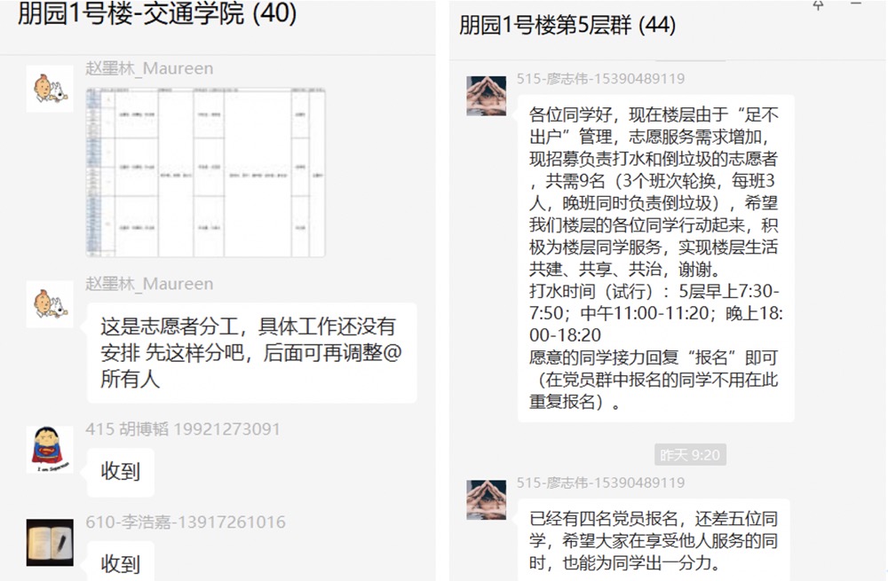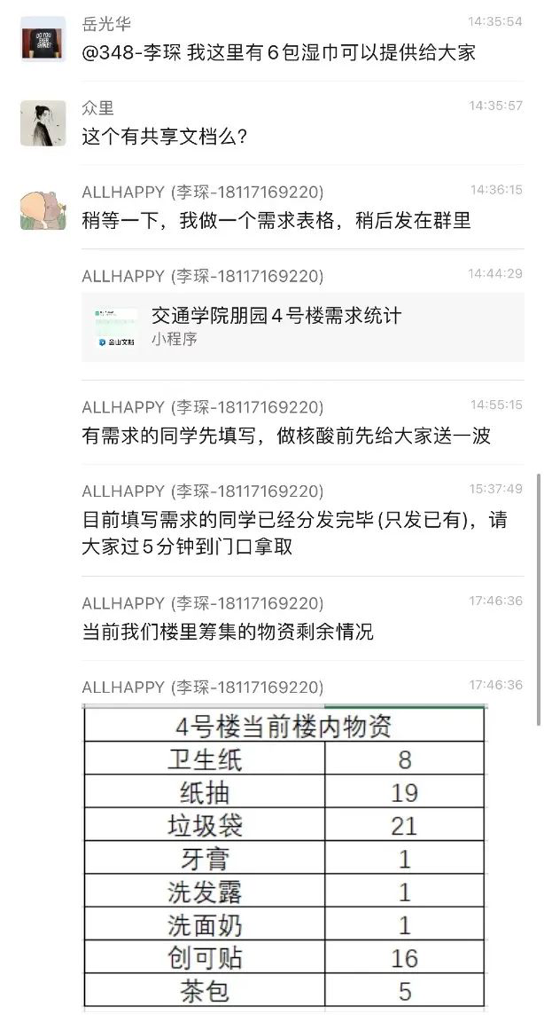 校内全部楼宇进入闭环管理后,各楼物资资源紧张,部分同学宿舍储备不足。伟德国际1946员工率先发起物资互助文档,以在线共享文档形式发布自己可提供物资、紧缺物资信息,同路人的使命担当惠及全校师生。