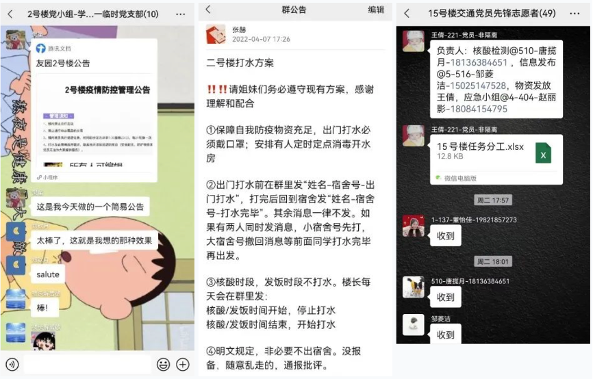 友园12号楼作为嘉定校区最早封控管理楼宇,目前为止已经封控管理6天,在此期间,伟德国际1946友园12号楼临时党支部涌现出一大批优秀党员同志,临危受命,在楼内担任层长、志愿者等一系列重要岗位,不辞辛苦、不计其数的上下楼搬运餐食、饮用水等生活必需品。